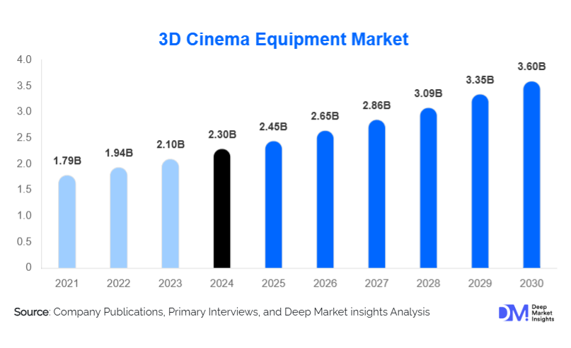 According to Deep Market Insights, the global 3D Cinema Equipment Market size is projected to grow from USD 2.45 Billion in 2025 to reach USD 3.6 Billion by 2030, expanding at a CAGR of 8.1% during the forecast period (2025–2030).